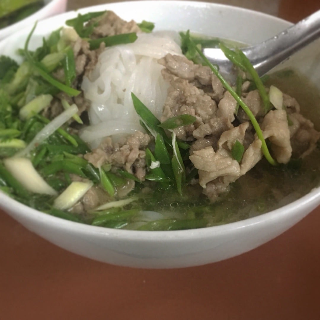 これがここのお店のフォーです。ニラが凄いんです。クタっとしていて甘い香りを放っていました。深く身体に染み渡る牛の出汁と絹のようなフォーの食感。